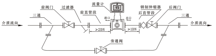 5、任何情况下,在涡轮流量计的上游应安装一段公称直径与流量计的公称直径相同的直管段,长度要求≥2DN;同时其下游也须安装一段与流量计的公称直径相同的直管段或弯管,并且要求其总长≥2DN。