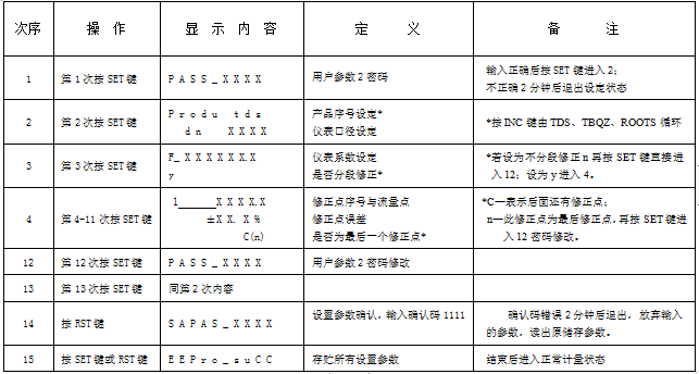 1、流量计各参数的代号、定义及操作次序见表4、表5,用户不得随意更改参数。