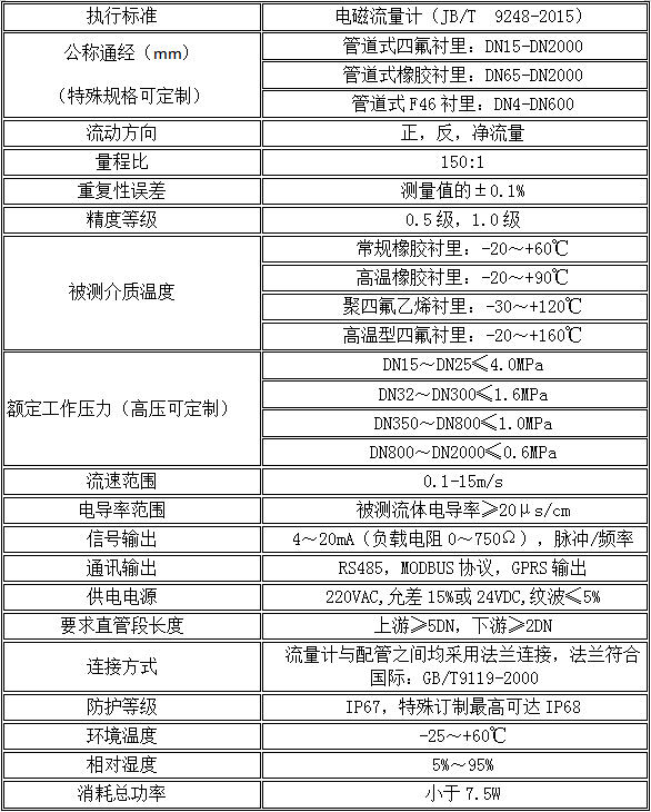 三、不锈钢电磁流量计主要技术参数